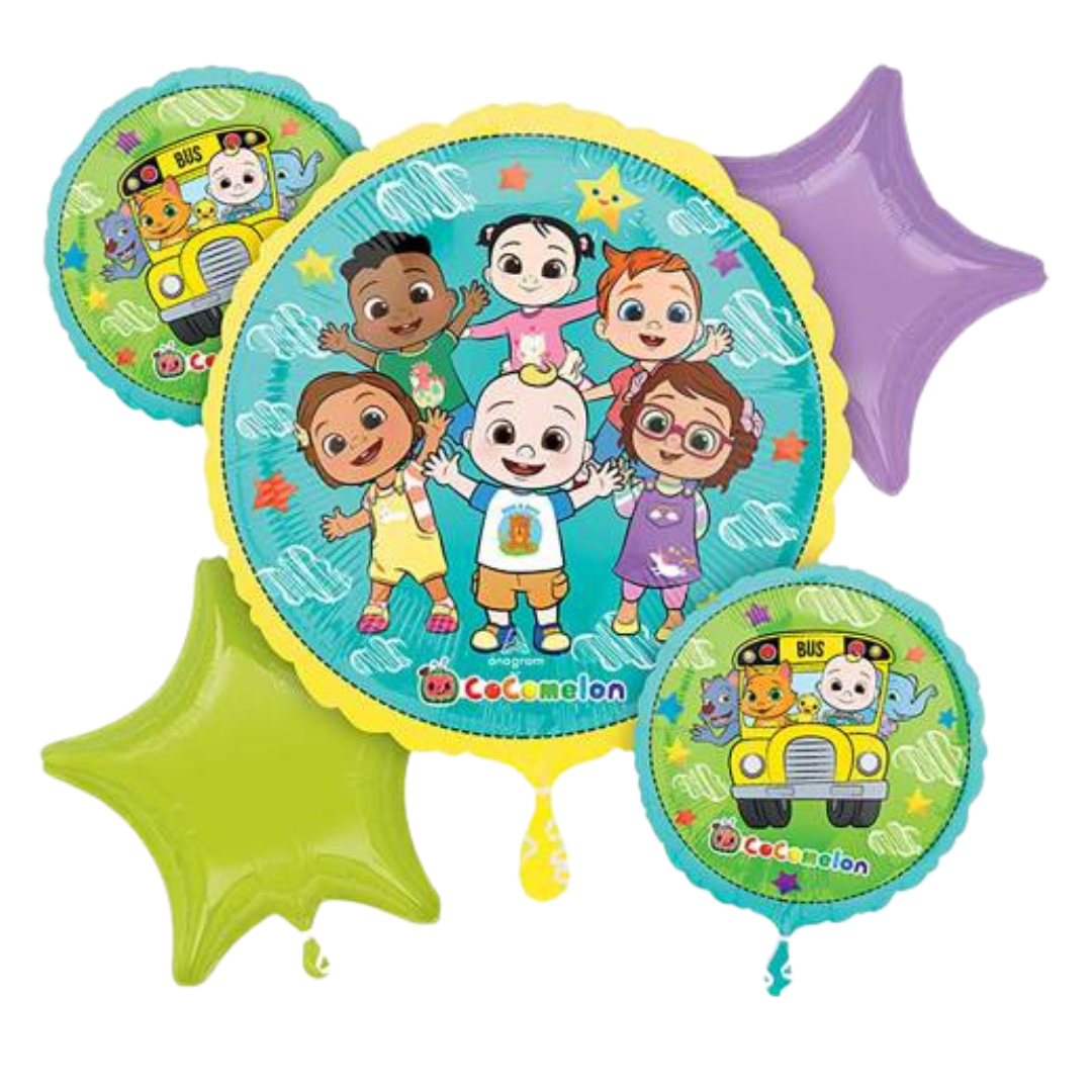 - 5 Piece cocomelon foil balloon bouquet (featuring cocomelon supershape and coordinating star shapes)