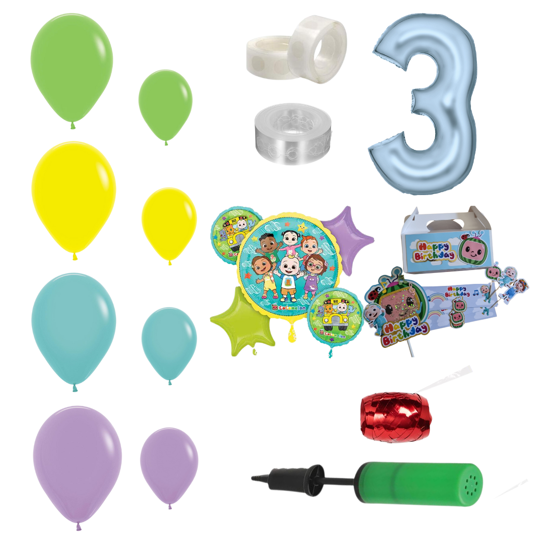 - 240 latex balloons in cocomelon-themed colors (rainbow)