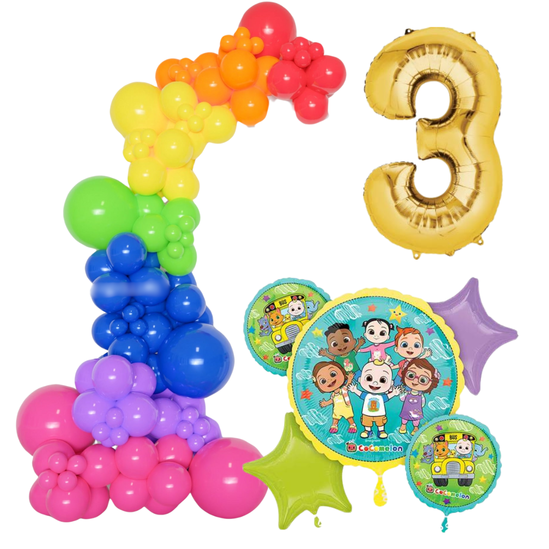 - 240 latex balloons in cocomelon-themed colors (rainbow)
