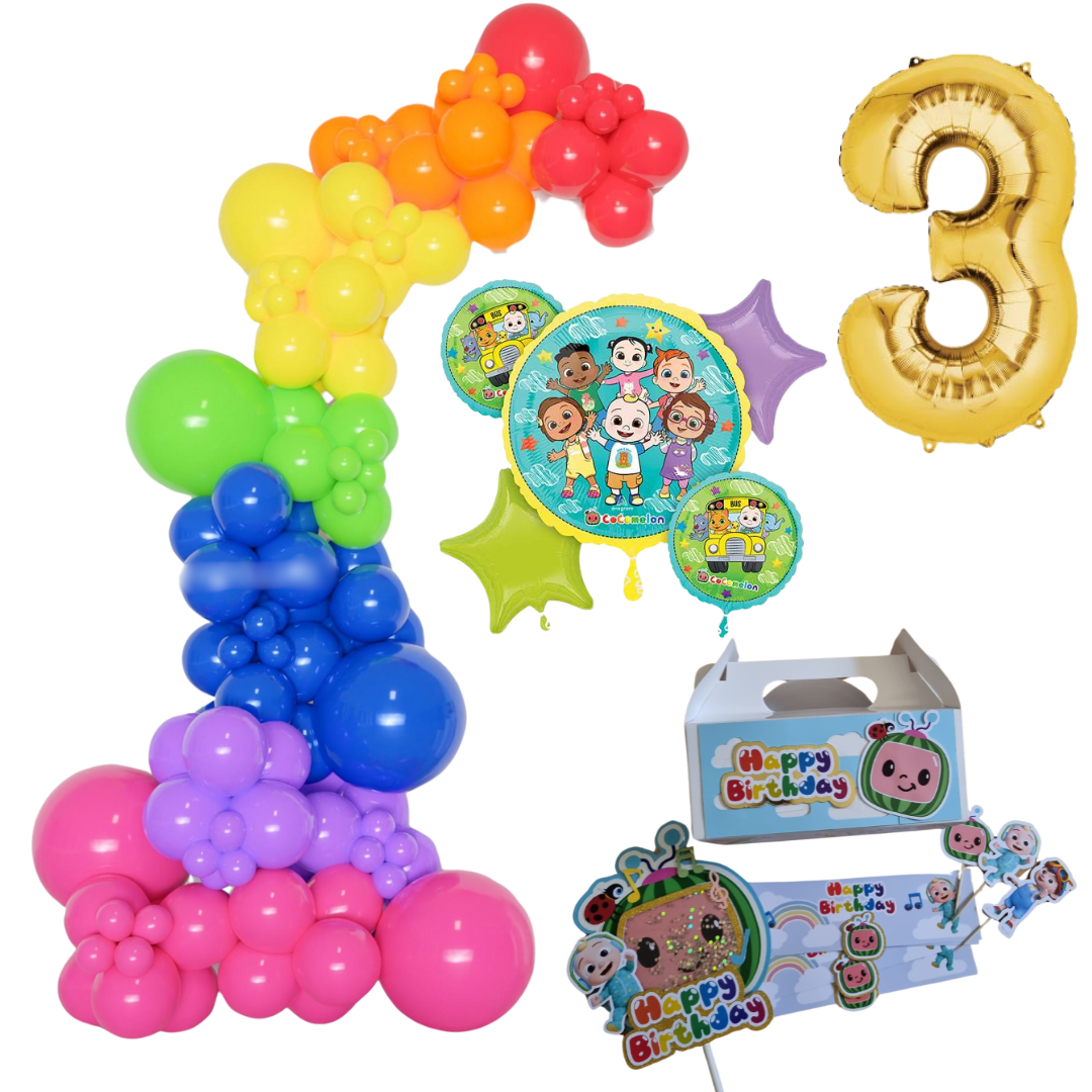 Cocomelon Themed Rainbow Balloon Garland Kit Number 3 with Party Decor white