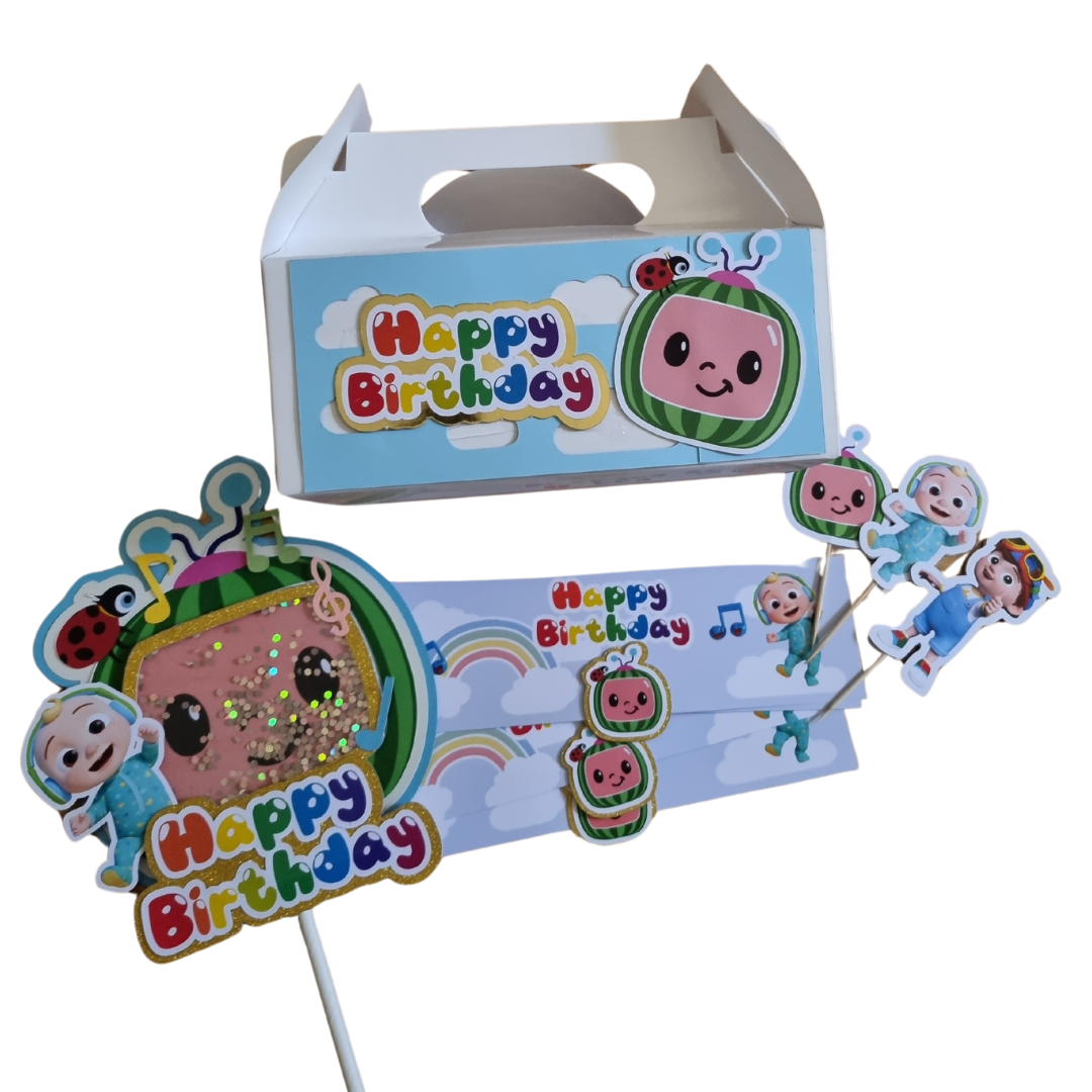 - 5 Piece cocomelon foil balloon bouquet (featuring cocomelon supershape and coordinating star shapes)