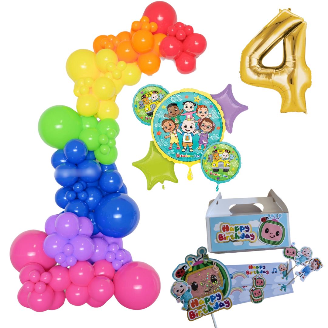 Cocomelon Themed Rainbow Balloon Garland Kit Number 4 with Party Decor white