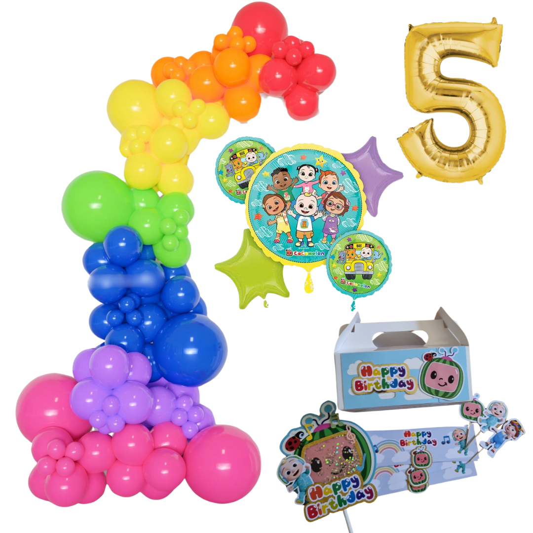 Cocomelon Themed Rainbow Balloon Garland Kit Number 5 with Party Decor white