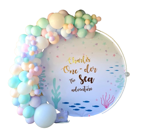 Transform your event into an enchanting underwater world with our Round Backdrop and Balloon Garland. Available in a variety of colors and themes to suit your vision.