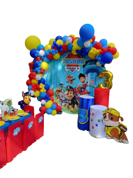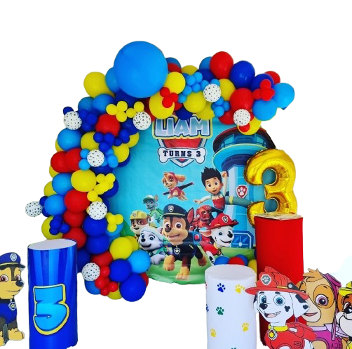 PAW PATROL PARTY DECOR, Round Backdrop Balloon Garland Plinth and Character Cutouts