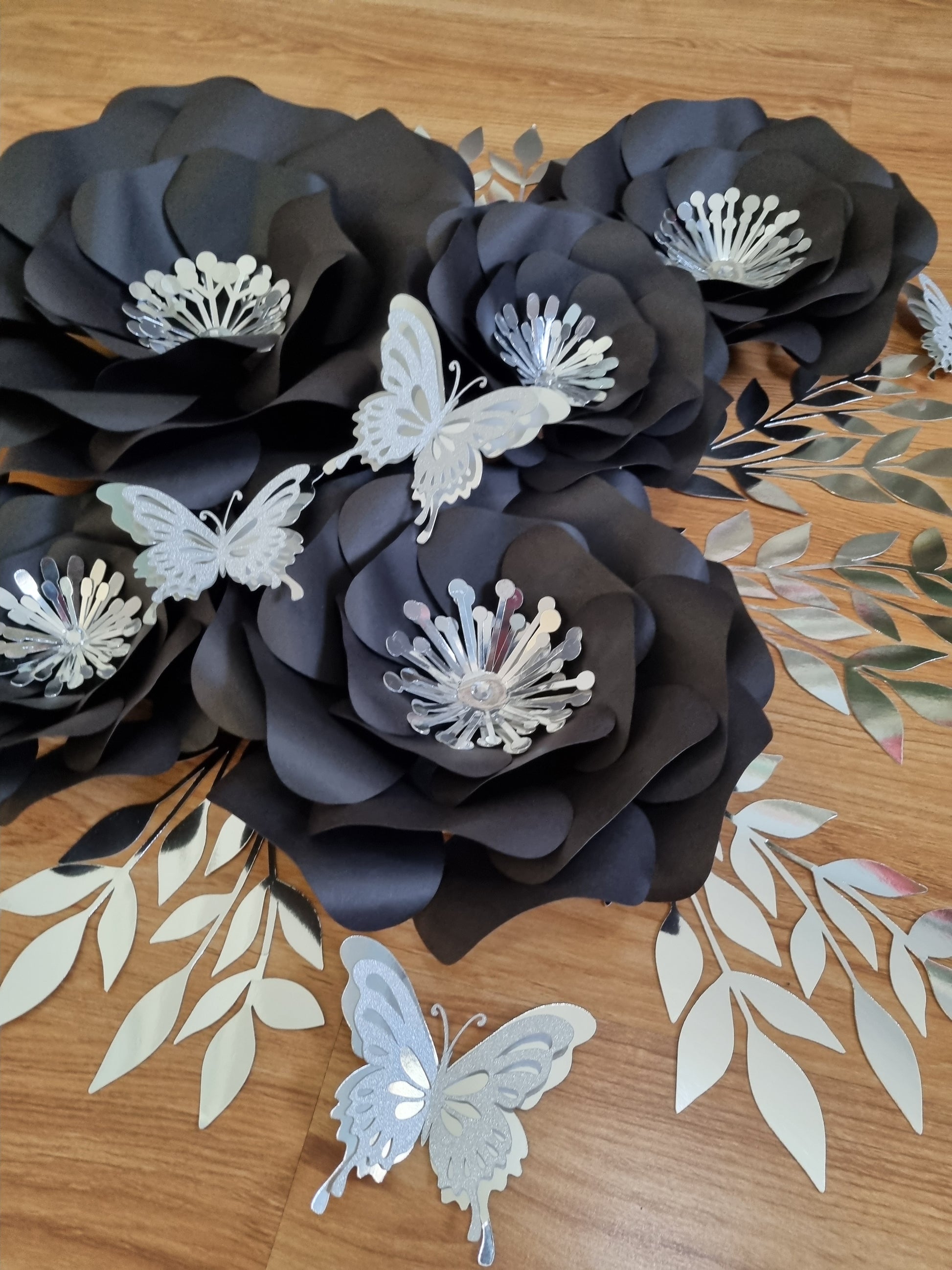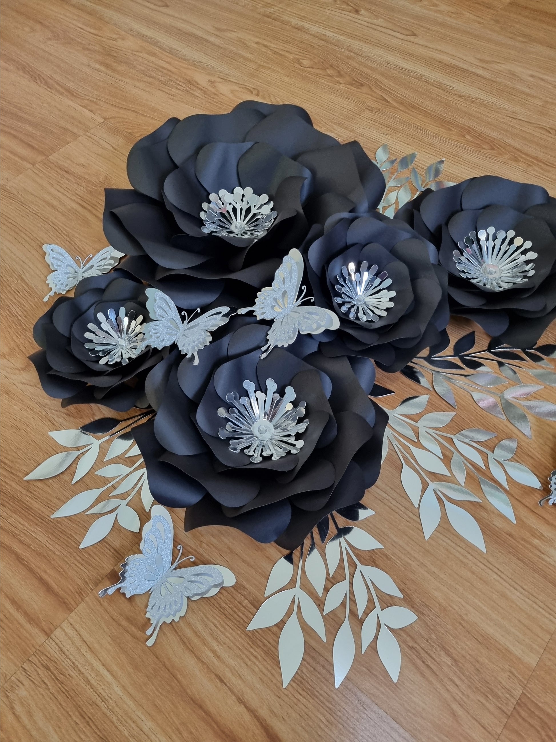 DO IT YOURSELF SET OF 5 PAPER FLOWERS WITH PAPER BUTTERFLIES AND LEAVES BLACK AND SILVER, Nursery paper flowers, nursery decor, paper flowers backdrop, birthday, baby shower