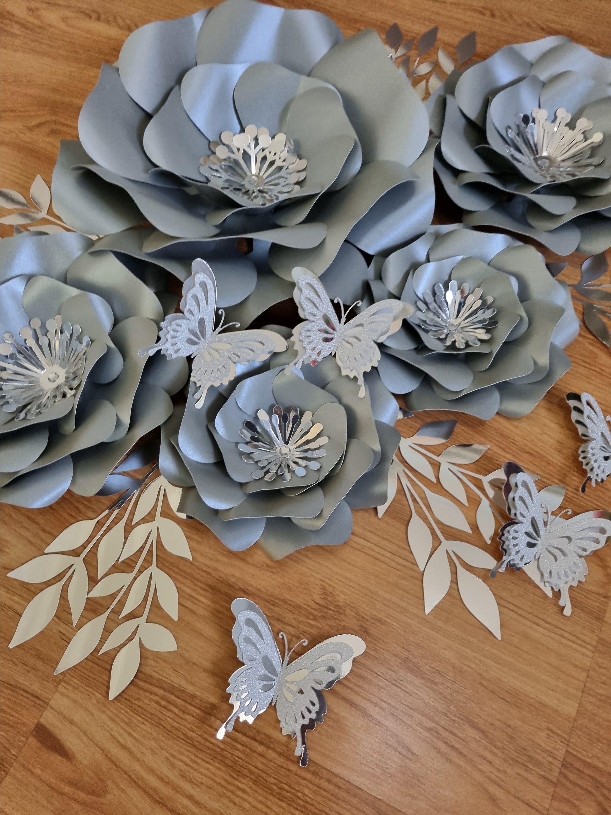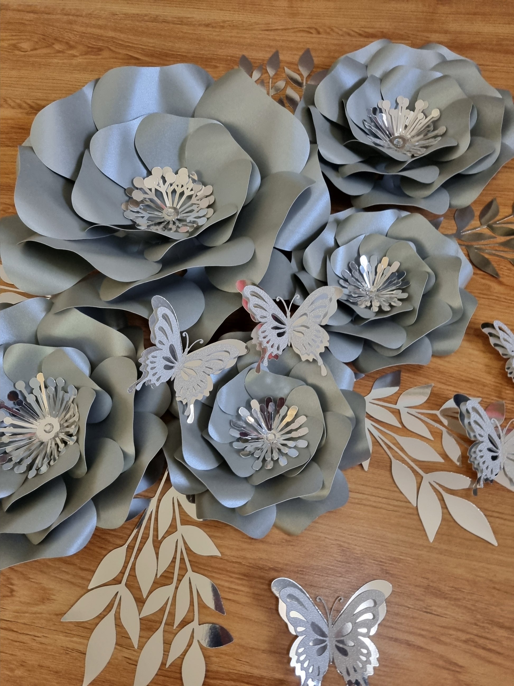 DO IT YOURSELF SET OF 5 PAPER FLOWERS WITH PAPER BUTTERFLIES AND LEAVES GREY AND SILVER, Nursery paper flowers, nursery decor, paper flowers backdrop, birthday, baby shower