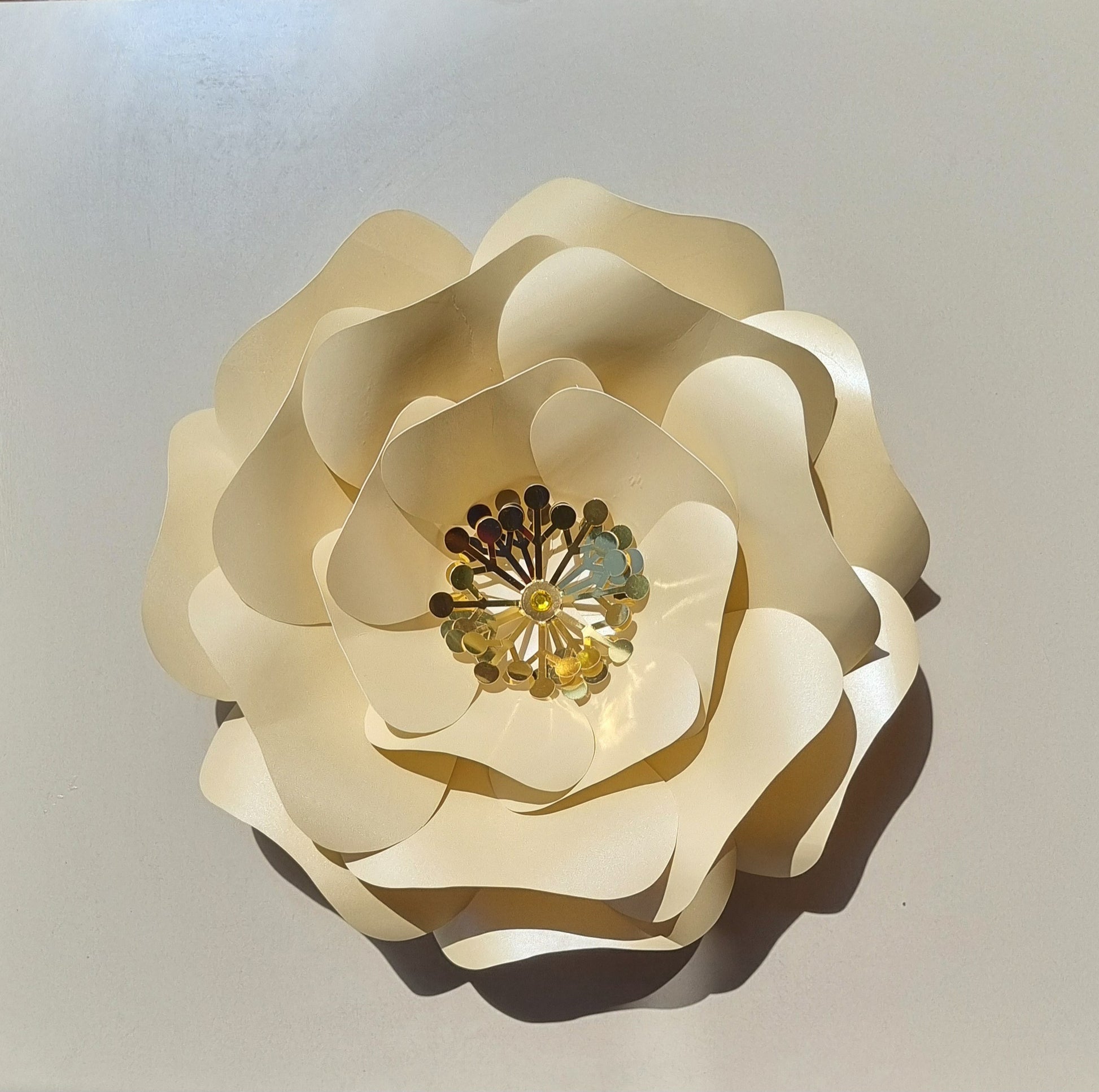 Flower is not assembled. Paper flower can be attached to the wall with thick white double-sided tape or a hook/nails