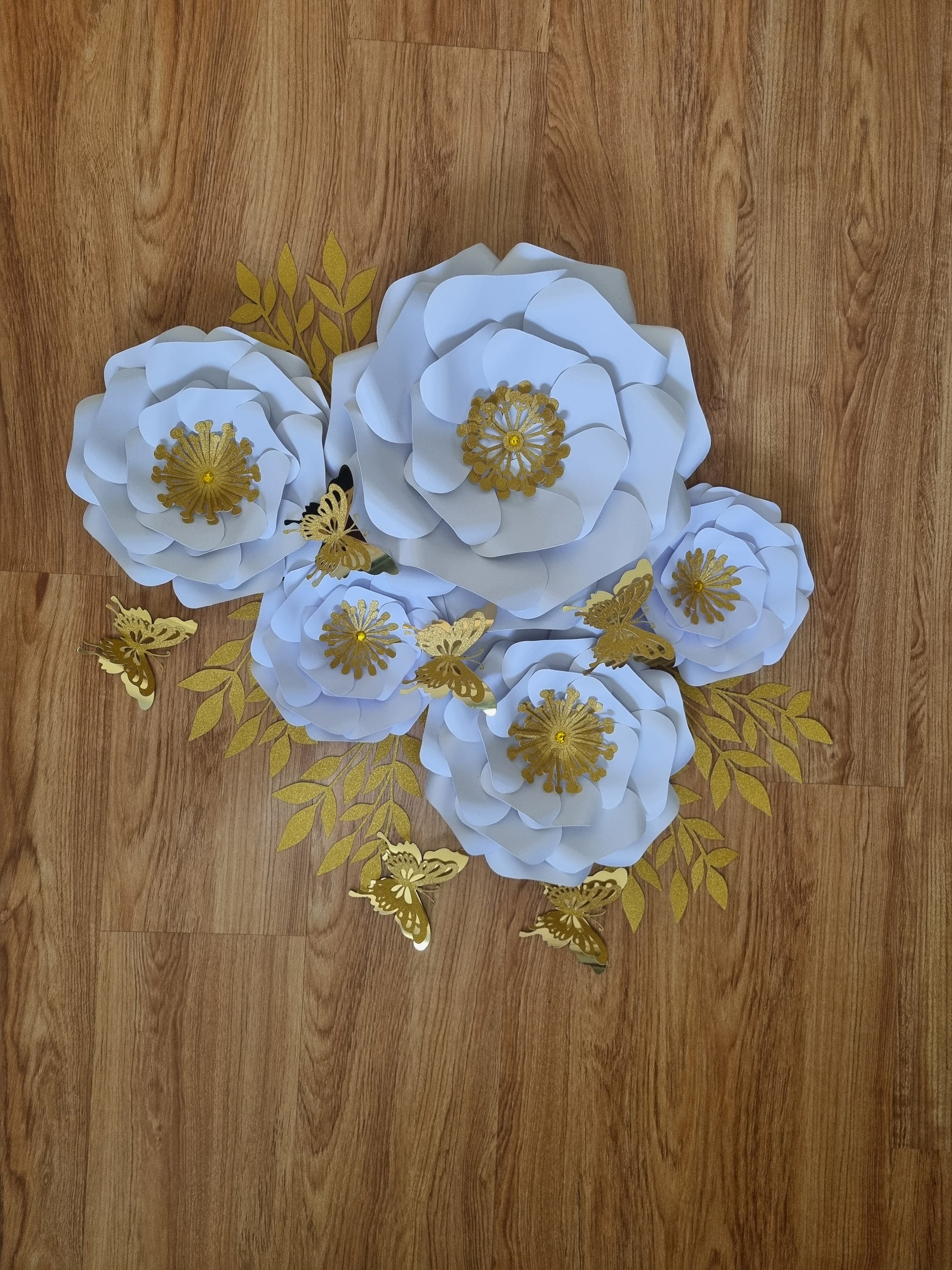 DO IT YOURSELF SET OF 5 PAPER FLOWERS WITH PAPER BUTTERFLIES AND LEAVES WHITE AND GOLD, Nursery paper flowers, nursery decor, paper flowers backdrop, birthday, baby shower