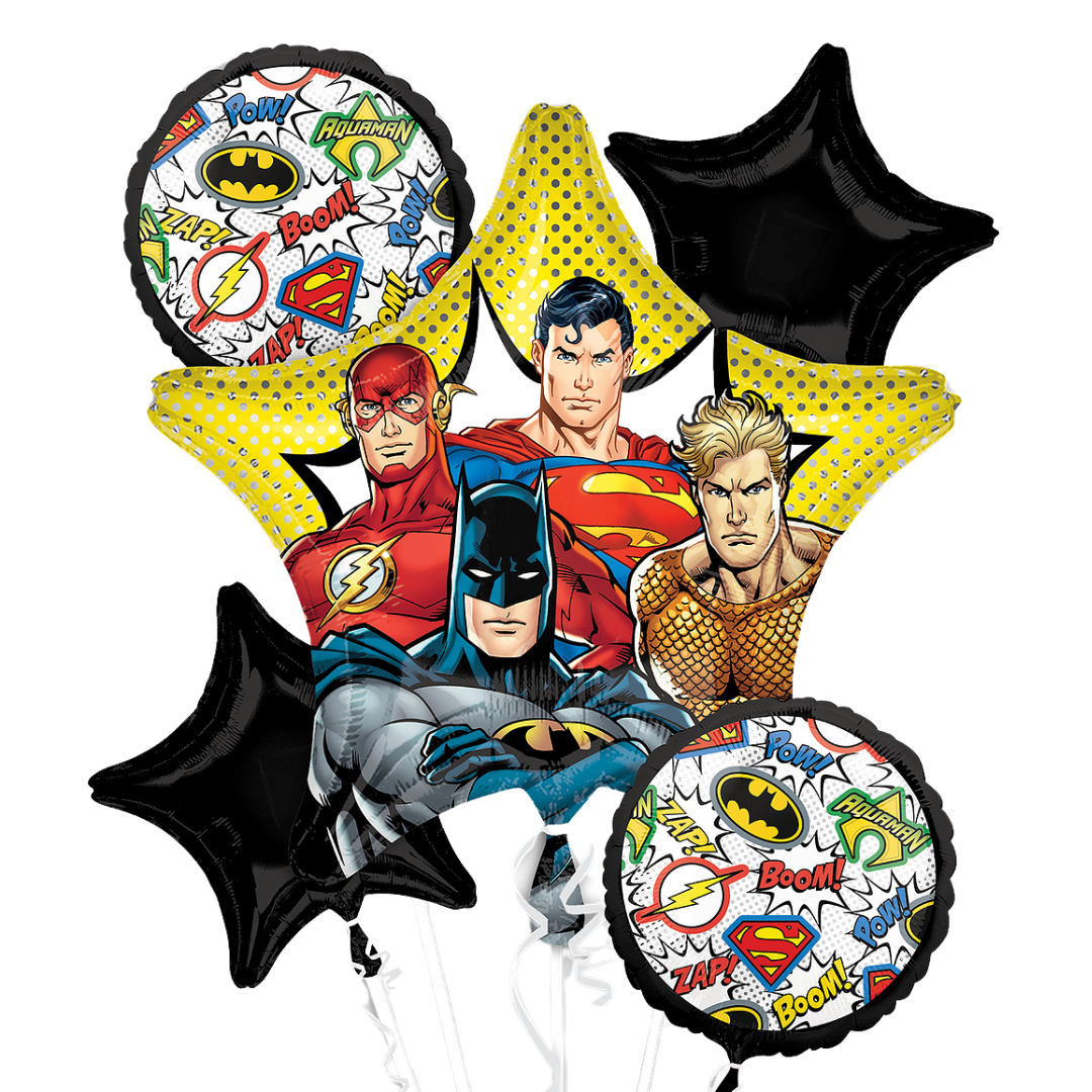 Unite the heroes at your party with our Justice League balloon bouquet! Featuring Superman, Batman, and more, this 5-piece set is perfect for adding superhero style to your celebration.