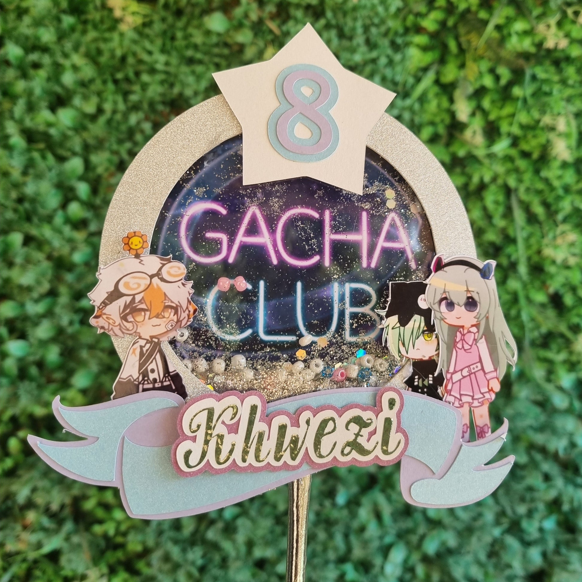 GACHA CLUB CAKE TOPPER birthday party themed decor glitter shaker style personalized with name and age