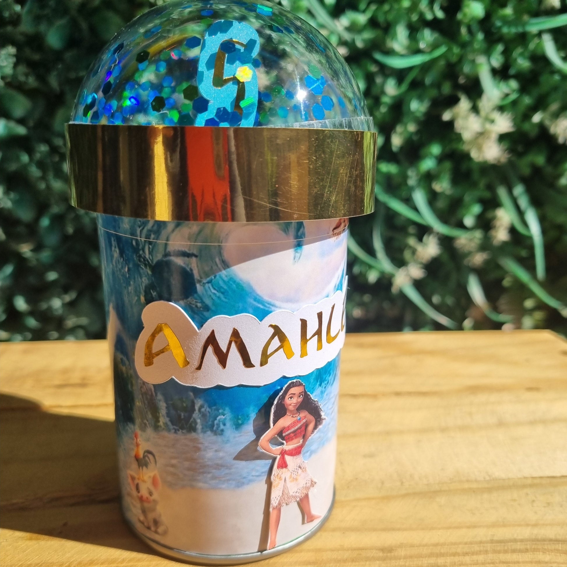 Celebrate your little voyager's special day with our Moana-themed Pringles, wrapped in vibrant island-inspired graphics and topped with a magical glitter shaker dome lid. Each can is customized with your child’s name and age, making it a memorable addition to your party table, party packs, or photo setups.