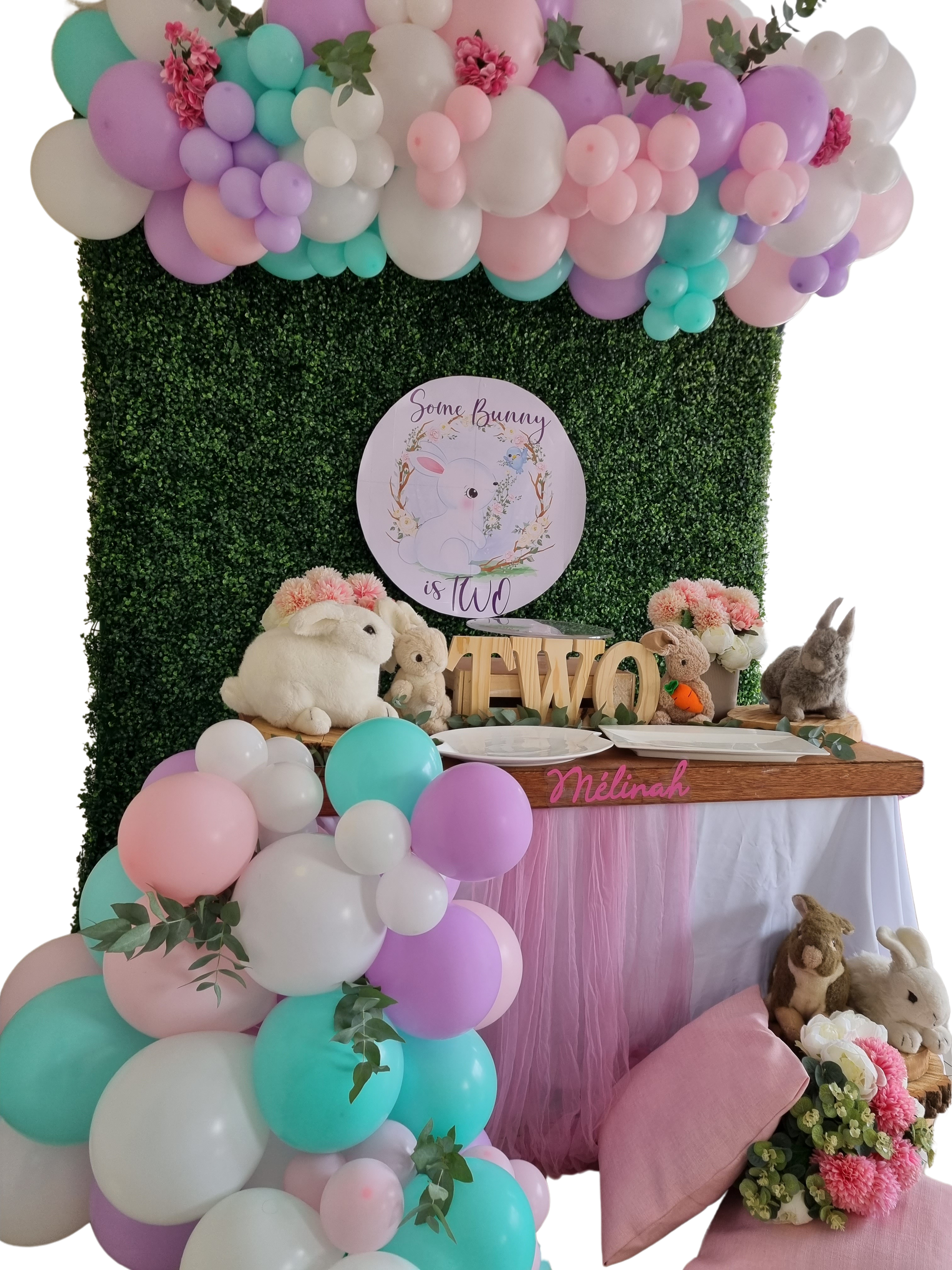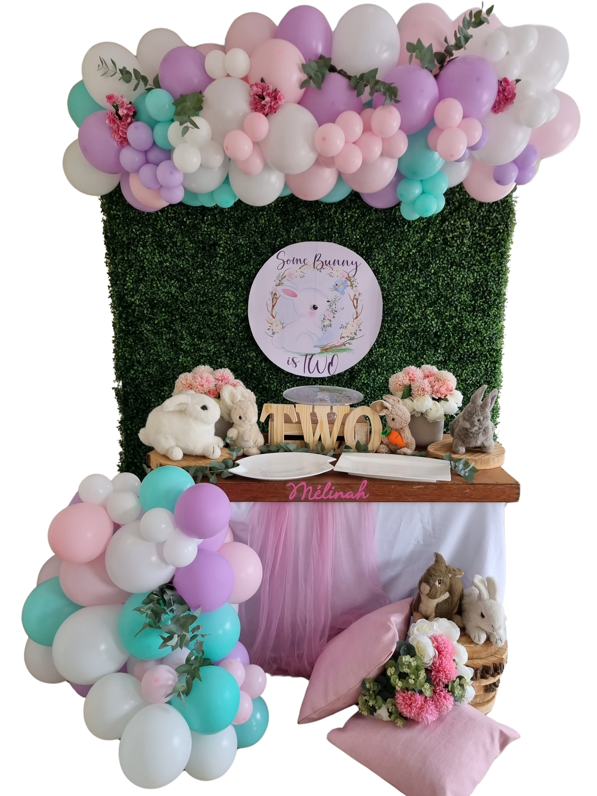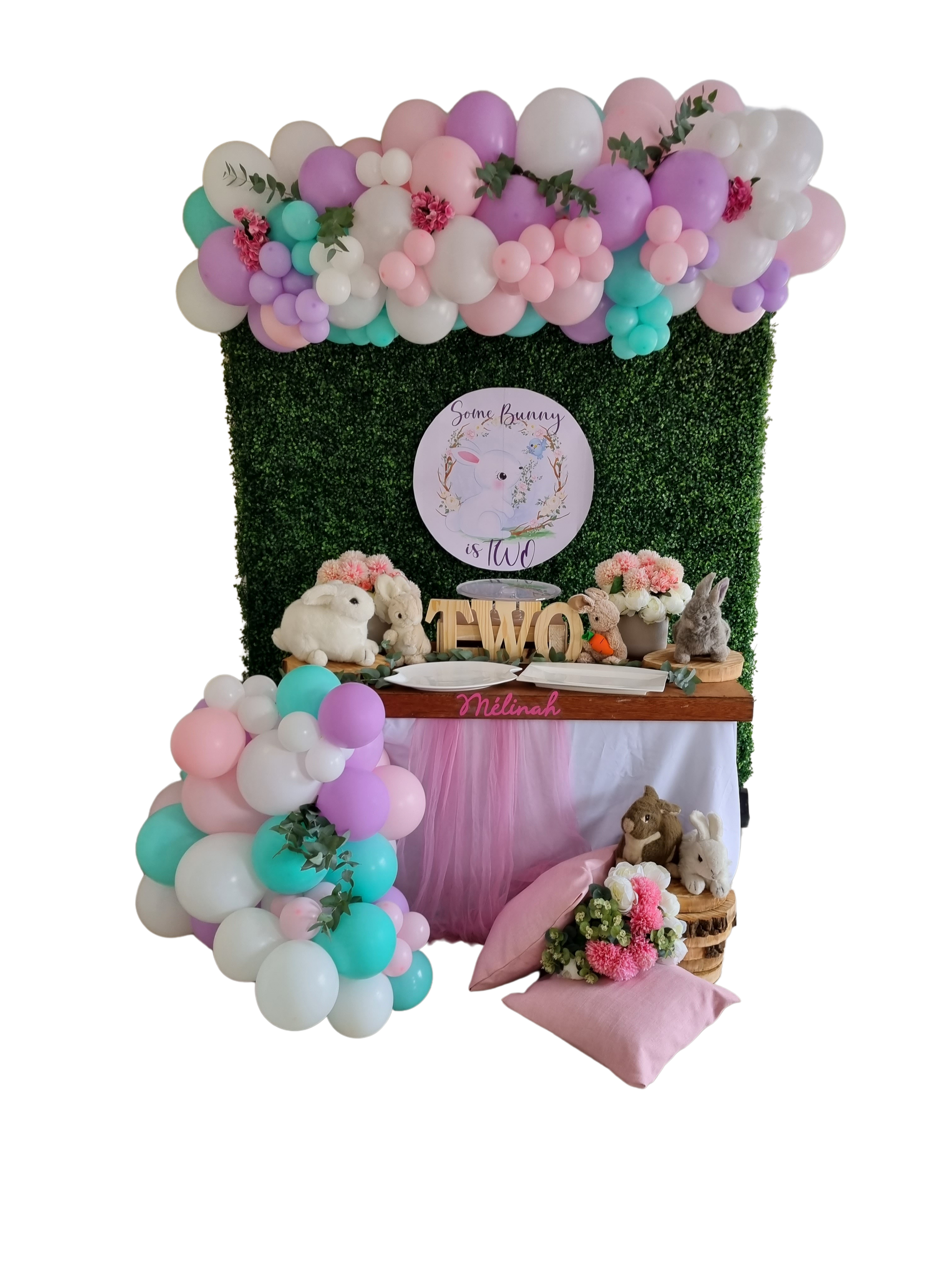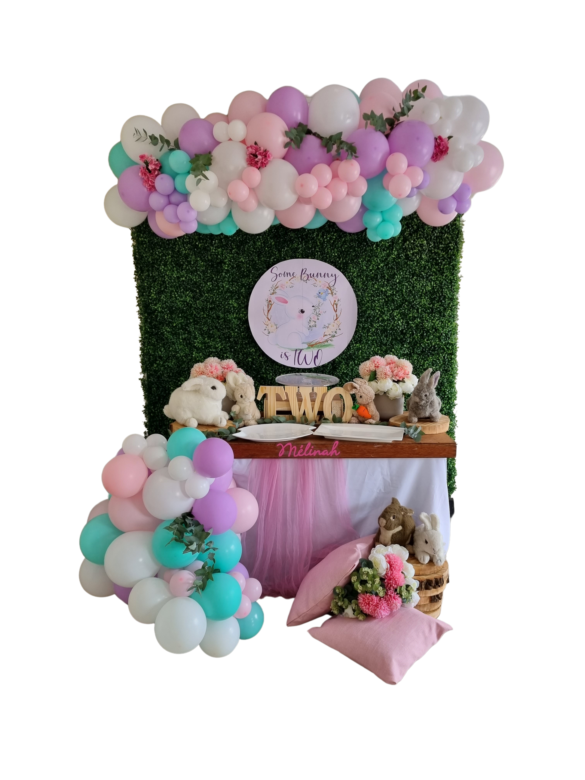 Create a charming and whimsical “Some Bunny” themed party with our elegant Rectangular Faux Green Backdrop, Organic Balloon Garland, and stylish Main Table. Perfect for Easter celebrations, baby showers, kids’ birthdays, and garden-themed events. Available for setup across South Africa.