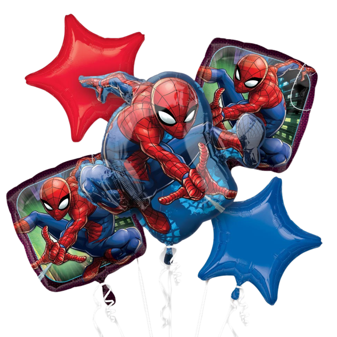- 5 Piece Spiderman foil balloon bouquet (featuring Spiderman and coordinating star shapes)