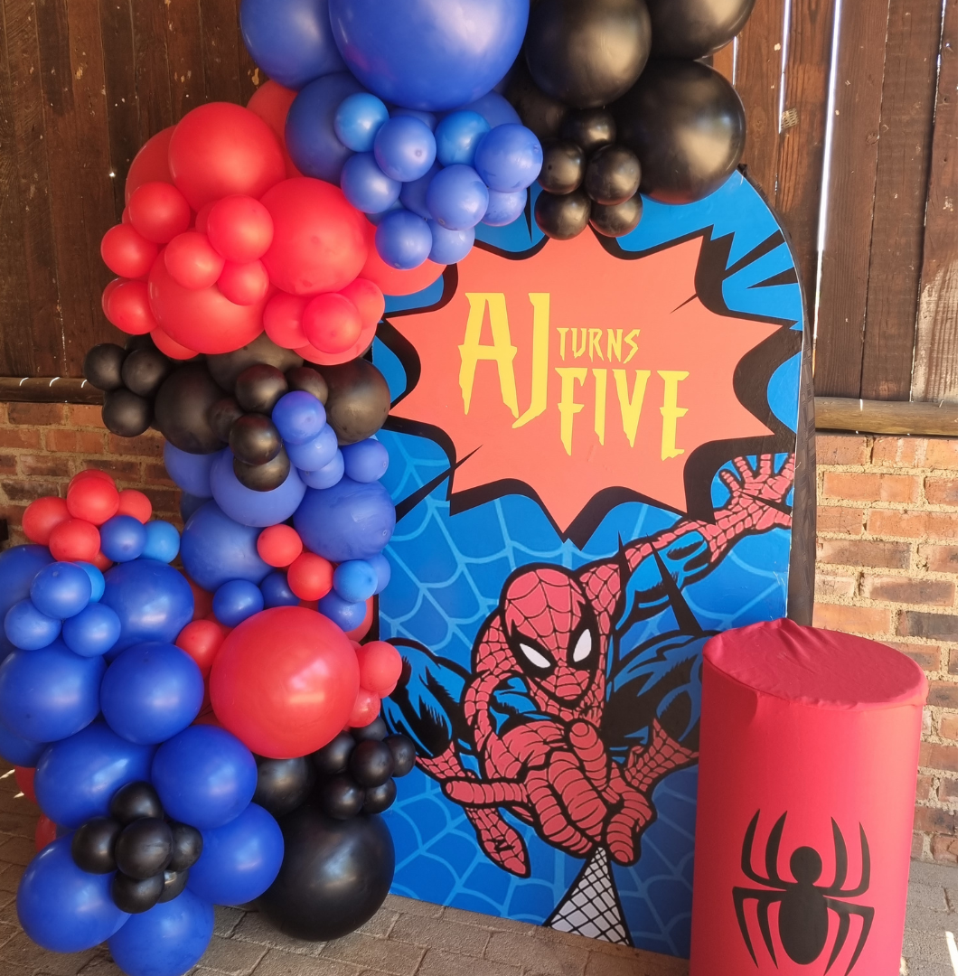 Crafted using a dynamic mix of red, blue, black, and white balloons, creating an organic design that beautifully frames the Spiderman backdrop. -